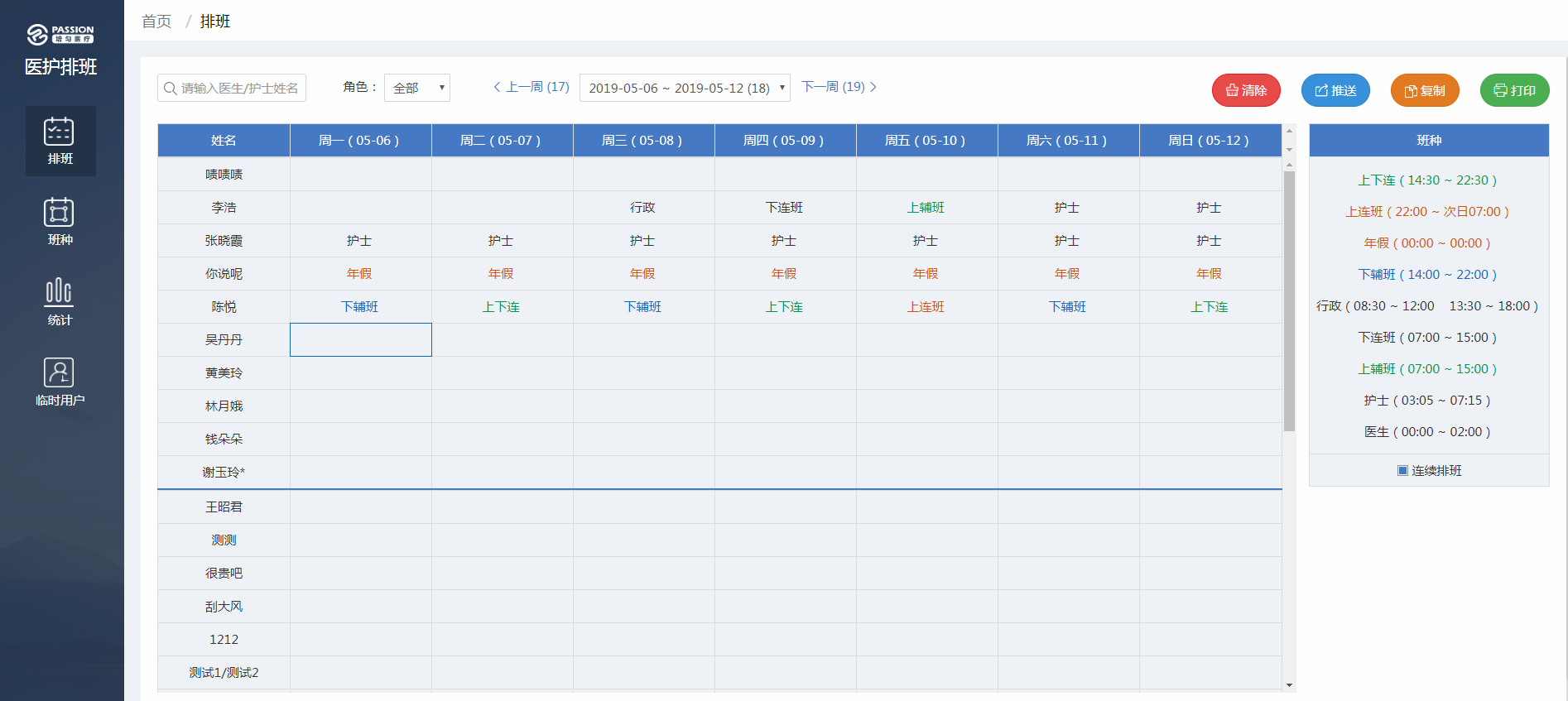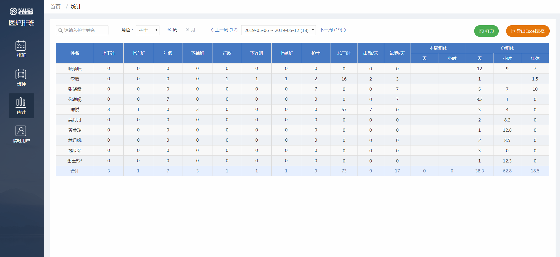 可按周或月的维度统计医护人员的排班情况,可打印和导出为Excel表格。
