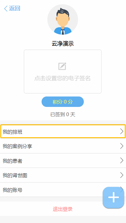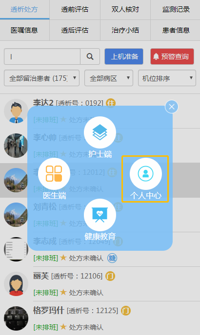 在微信进入云净公众号,点击【移动透析】,进入透析界面后,点击+号,在弹框点击【个人中心】,点【我的排班】进入医护排班查看模块即可查看实时的科室排班情况。